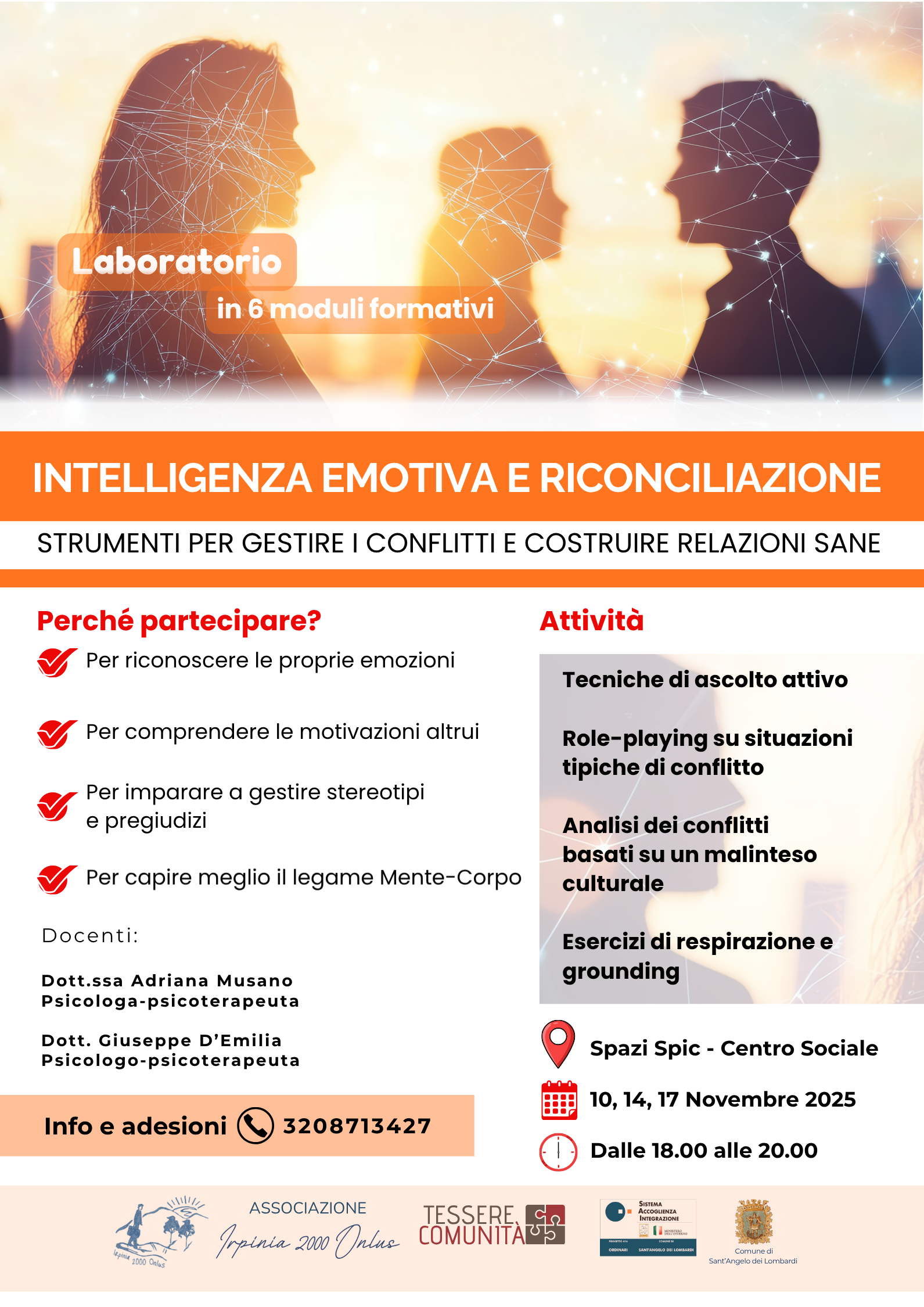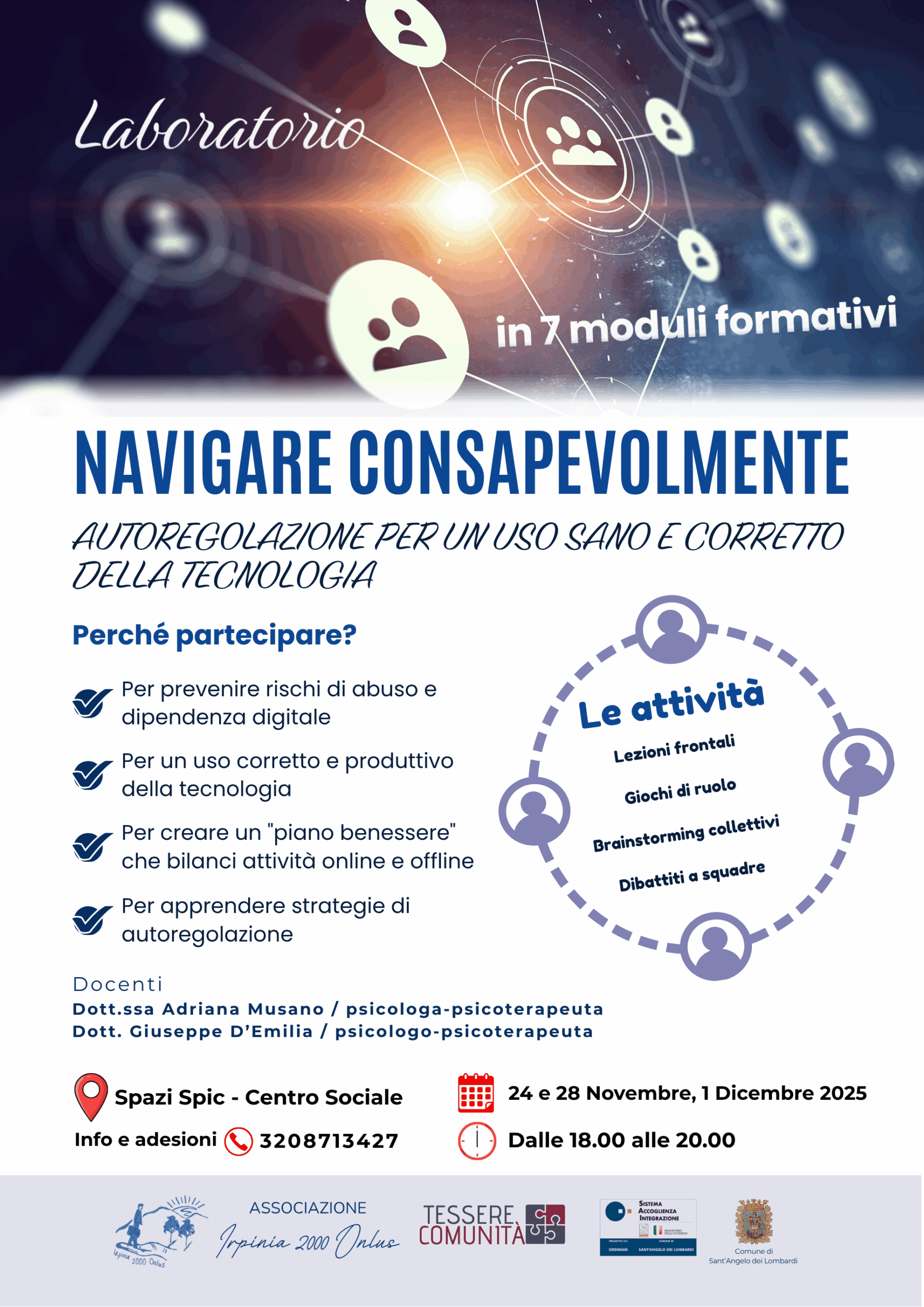 Sono stati presentati al Comune di Sant’Angelo dei Lombardi due laboratori destinati ai beneficiari del centro SAI e alla comunità locale. Entrambi saranno tenuti da psicologi-psicoterapeutici e toccano argomenti di grande attualità. Il primo ha come titolo e tema “Intelligenza Emotiva e Riconciliazione” e in particolare intende fornire strumenti per la gestione dei conflitti e per costruire relazioni sane. Il secondo, dal titolo “Navigare consapevolmente”, offrirà le strategie di autoregolazione per un uso sano e corretto della tecnologia. L’ultimo laboratorio vedrà anche un approfondimento su social network e privacy. Tra le attività sono previsti brainstorming, giochi di ruolo, attività a squadre: l’interattività sarà in pratica la caratteristica dei due laboratori.